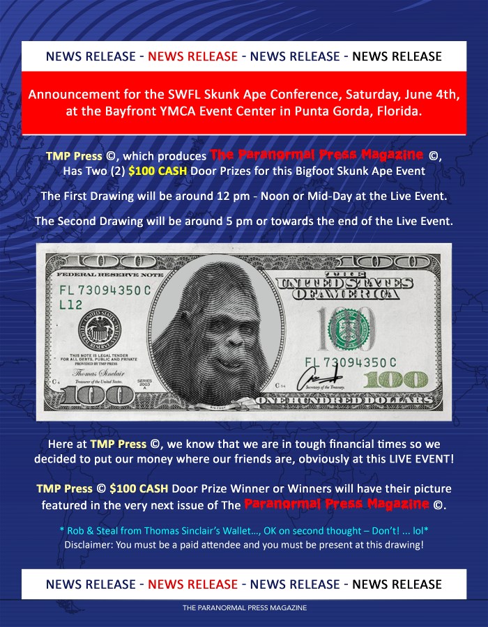 TMP Press, Bigfoot Database Magazine, and The Paranormal Press Magazine are not affiliated, associated, authorized, endorsed by, or in any way officially connected to the SWFL group or with any other company, agency or government agency. All product and company names are trademarks™ or registered® trademarks of their respective holders. Use of them does not imply any affiliation with or endorsement by them. TMP Press is trying to help SWFL and their conference try to be successful in every way. Any SWFL business should be taken up with their promoter/event manager (Phyllis Csaszar). The image (“Bigfoot” at the top of this page) is owned by TMP Press. Thank You!